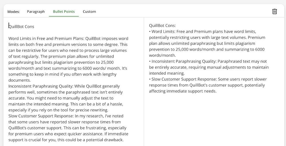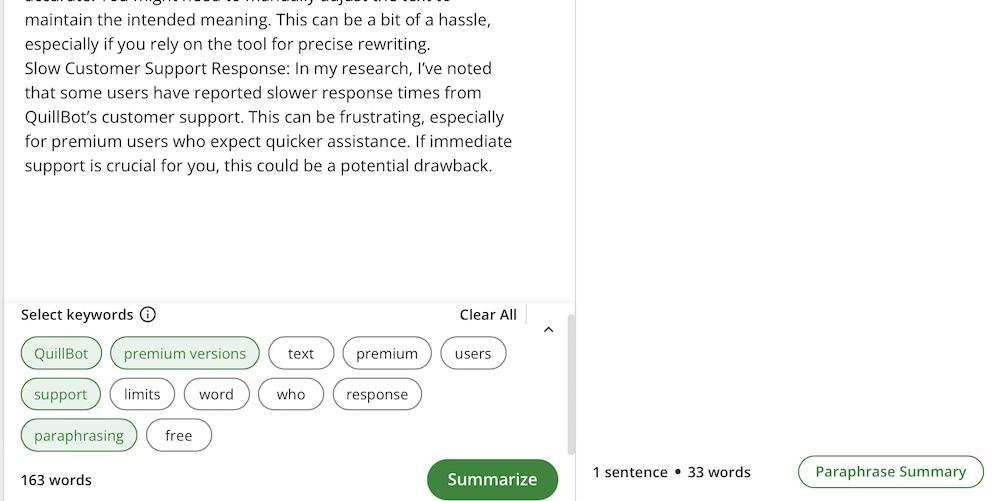 - Word limits in both free and premium plans: QuillBot imposes word limits on both free and premium versions to some degree. This can be restrictive for users who need to process large volumes of text regularly. The premium plan allows for unlimited paraphrasing but limits plagiarism prevention to 25,000 words/month and text summarizing to 6000 words/ month. It’s something to keep in mind if you often work with lengthy documents.