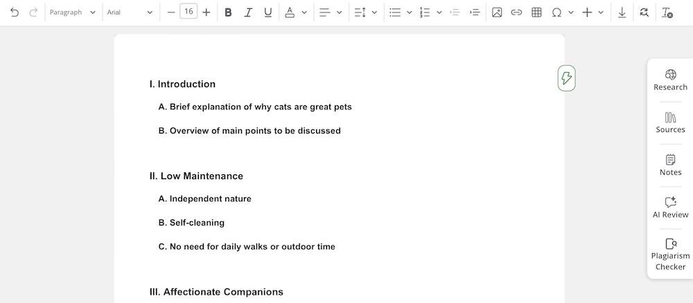 - Use the integrated research capabilities to find and cite sources directly within your document.