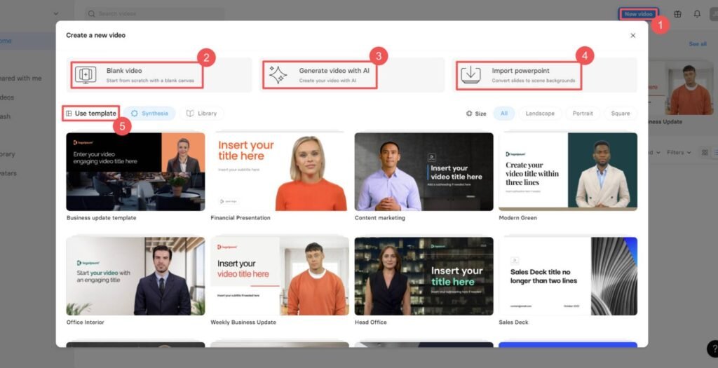 Getting started with a new video is easy. You can select your starting point after clicking the “New Video” button near the top right. You can start from a blank canvas, with AI, importing a PowerPoint, or from a template.