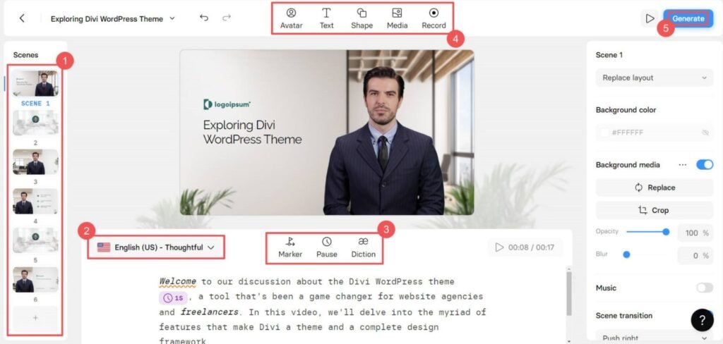 Based on our prompts above, Synthesia created six scenes of AI-generated text. We can select our language and voice and also markup our script to help the AI understand how to say what we have down. The script is also editable, so you can fully change whatever needs to be said. There are various other settings that you can work on. Once done, click “Generate” to create your finalized video.