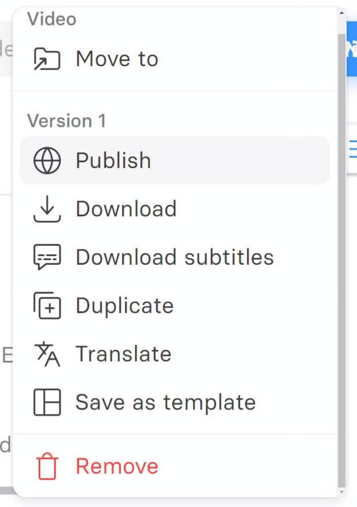 Once rendered, we have a few options. We can publish directly to a platform, download the video to our computer, download the transcripts, and a host of other things.
