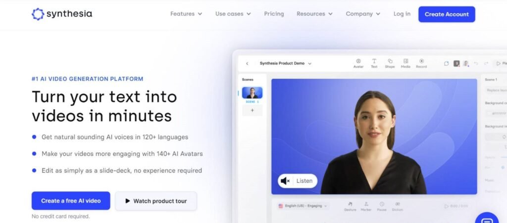 Synthesia is an AI-driven video creation tool that empowers you to produce high-quality, engaging videos without expensive equipment or specialized skills. It takes a unique approach to create videos by way of generating AI avatars (synthetic people that are human-like) that appear to be speaking words that you give it from a video script.